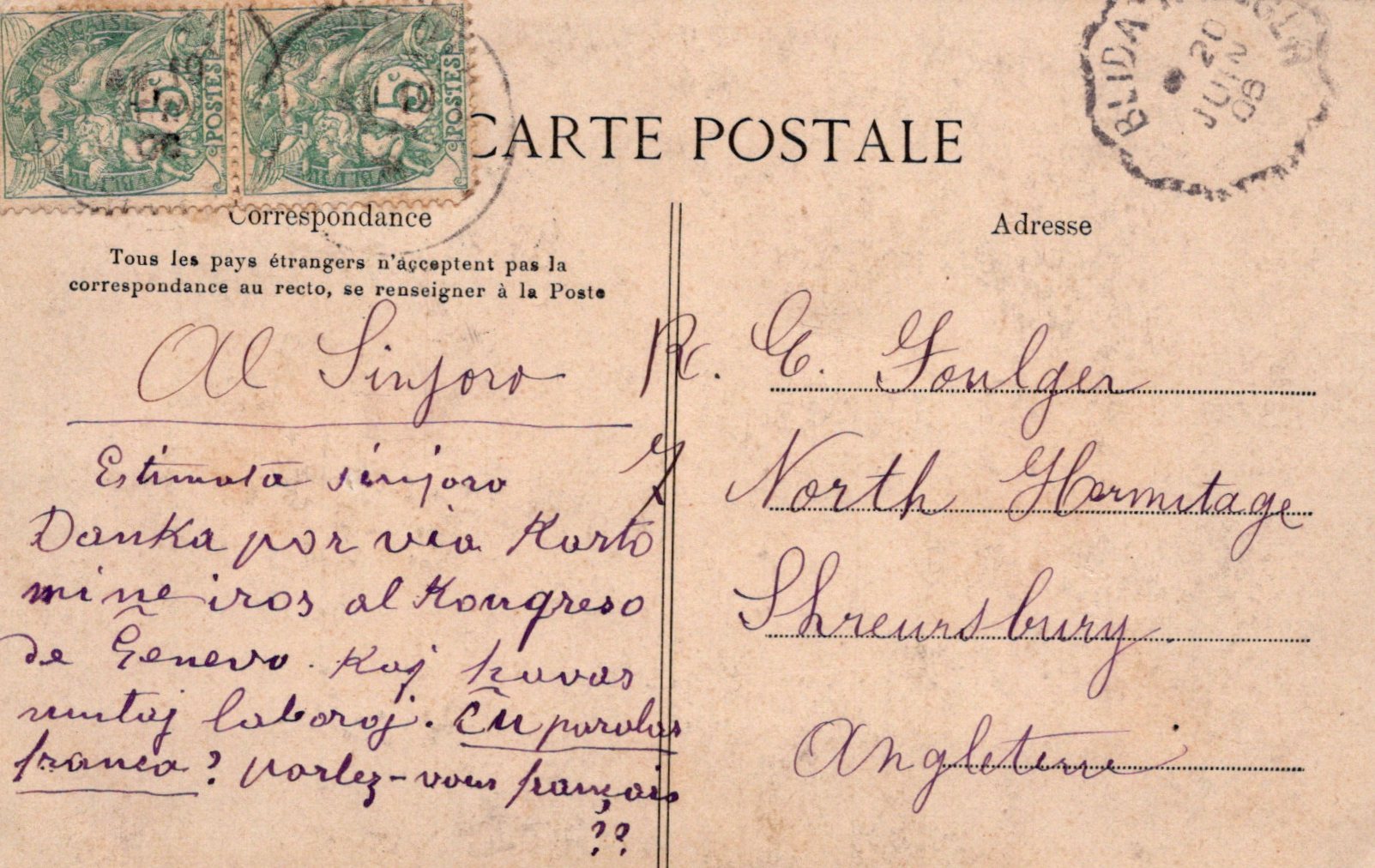 Vintage postcard with text and stamps, addressed to a recipient in Shrewsbury, England.