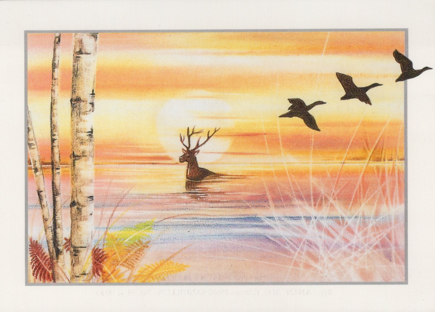 • Load image into Gallery viewer, Artistic depiction of a deer and birds with a sunset background