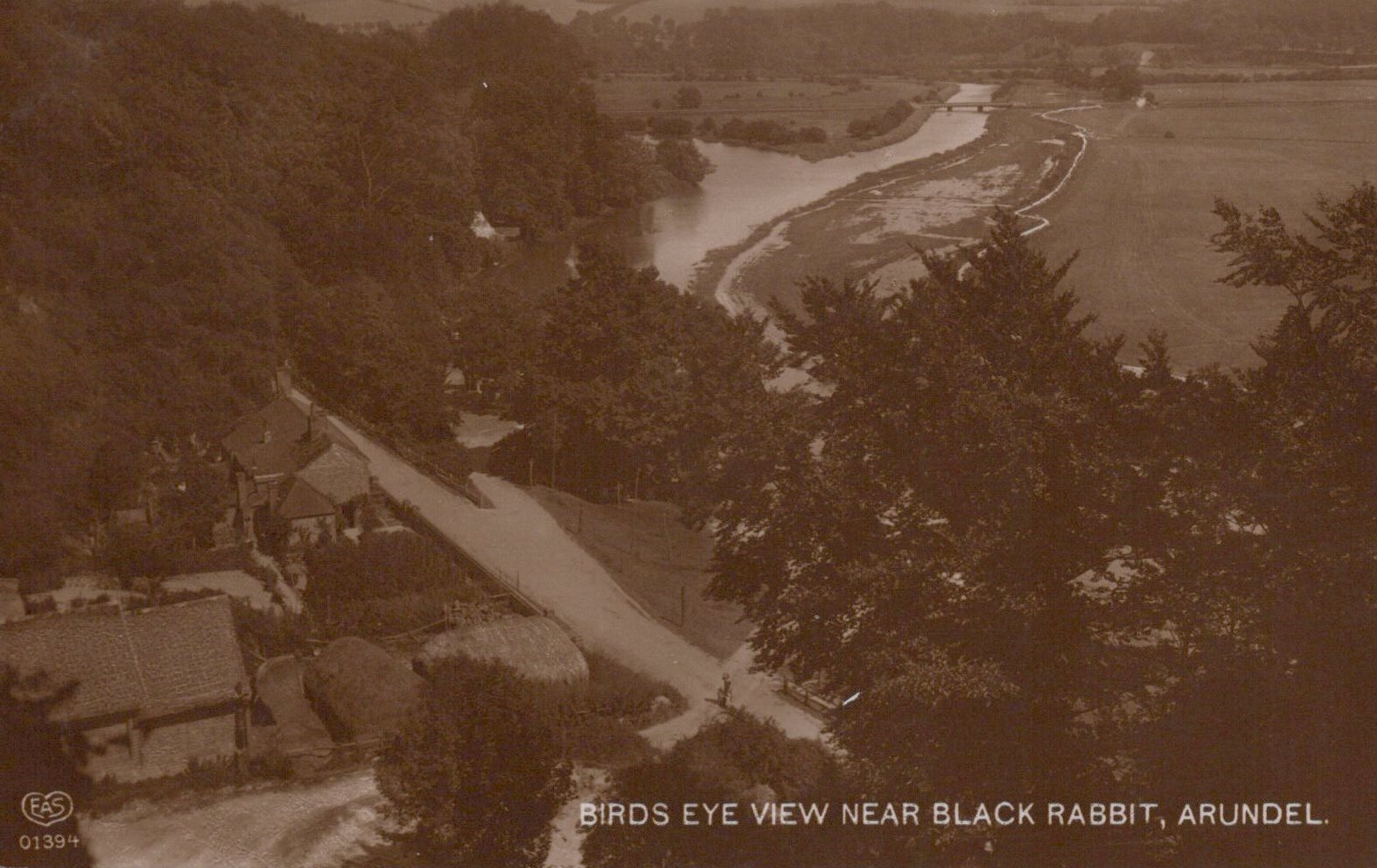 Sepia-toned aerial view of a river and surrounding landscape with text 'Birds Eye View Near Black Rabbit, Arundel'.