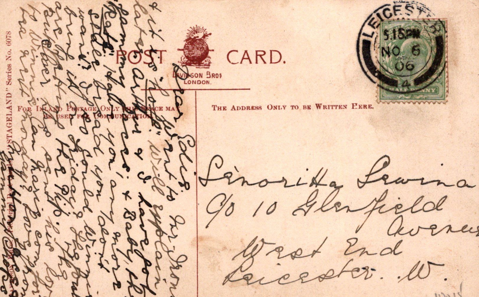 Vintage postcard with handwritten text and postage stamp, featuring the word 'Leicester'.