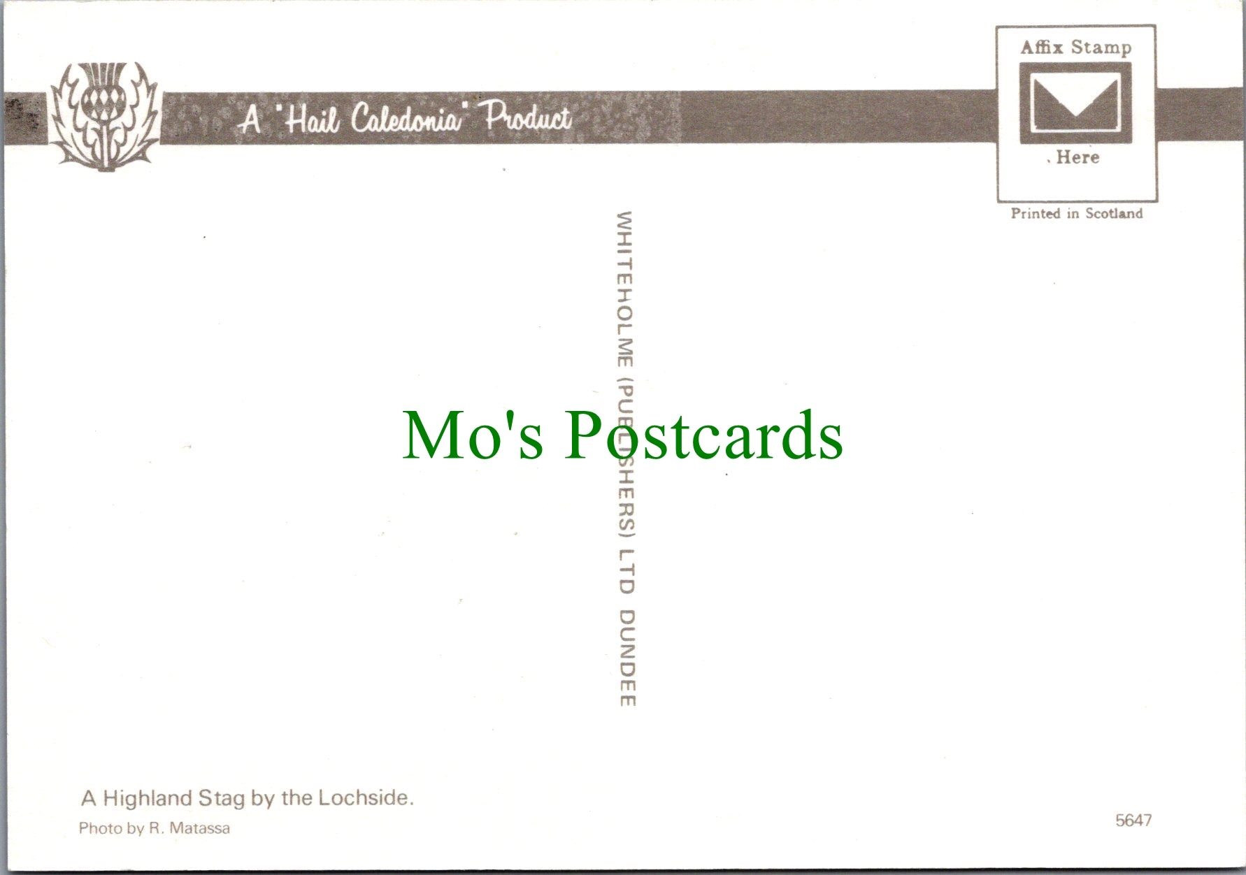 This is a postcard of A Highland Stag By The Lochside. Monarch of The Glen