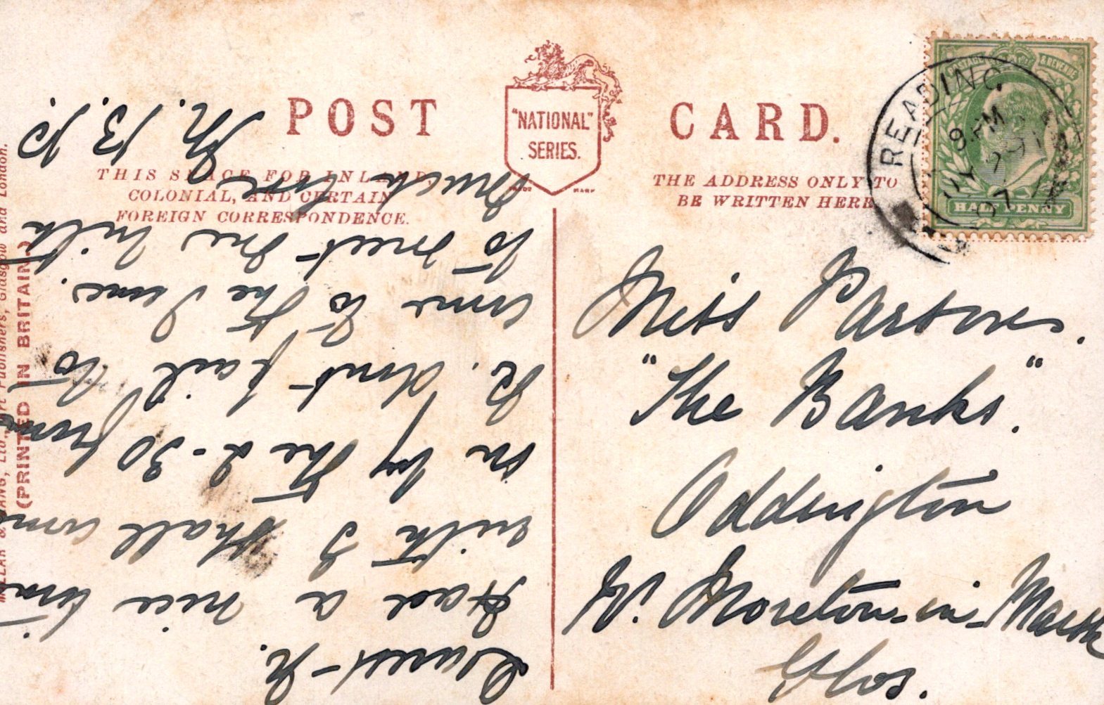 Vintage postcard with handwritten text and a stamp, featuring the National Series logo.