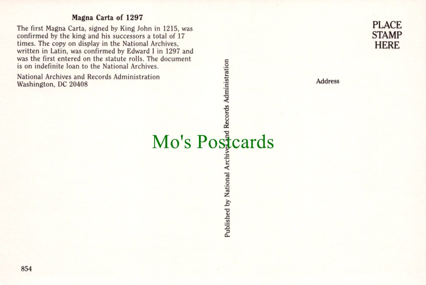 Mo's Postcards offers for sale a postcard showing the Magna Carta of 1297, National Archives, Washington DC.