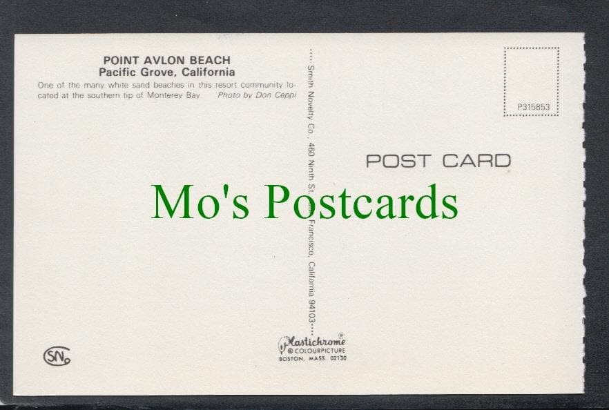 Mo's Postcards offers for sale a postcard of Point Avlon Beach, Pacific Grove, California.