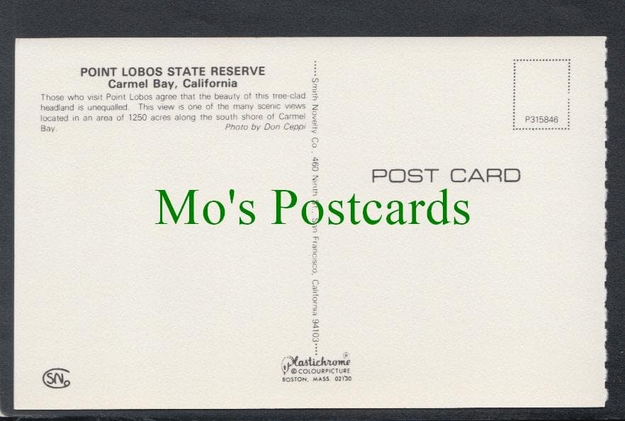 Mo's Postcards offers for sale a postcard of Point Lobos State Reserve, Carmel Bay, California.