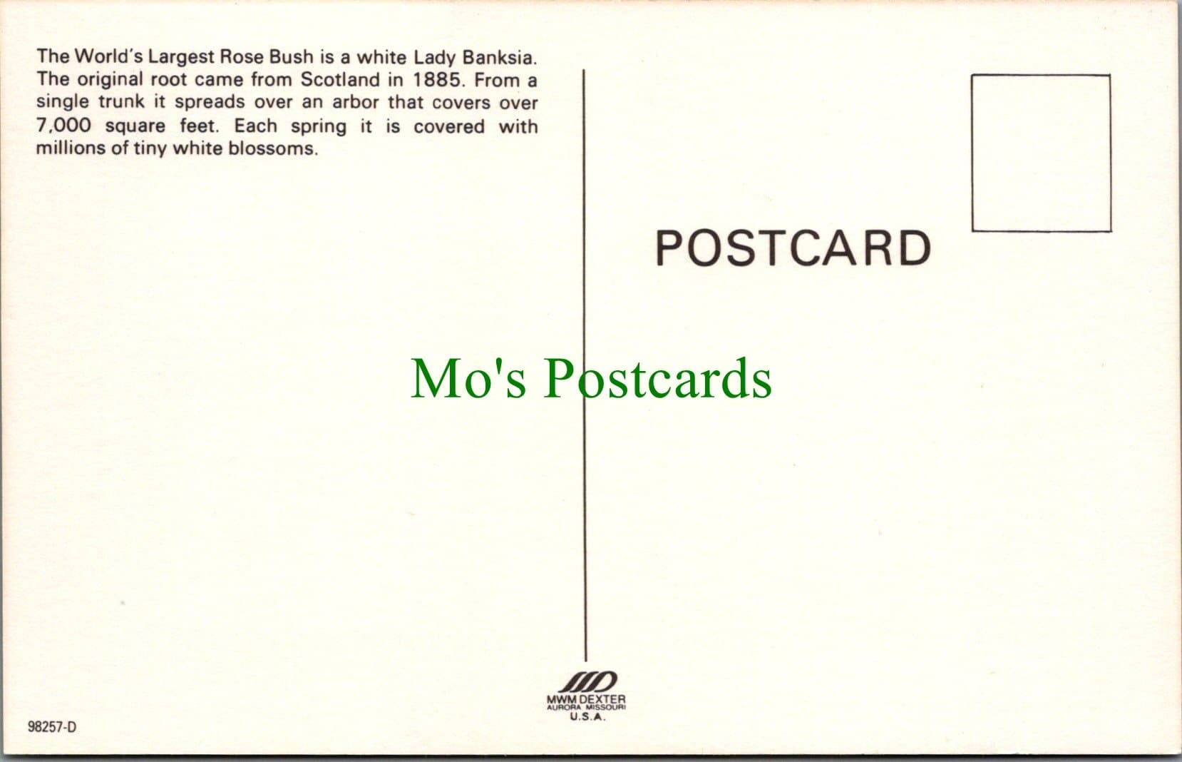 Mo's Postcards offers for sale postcard of the World's Largest Rosebush, Tombstone, Arizona.