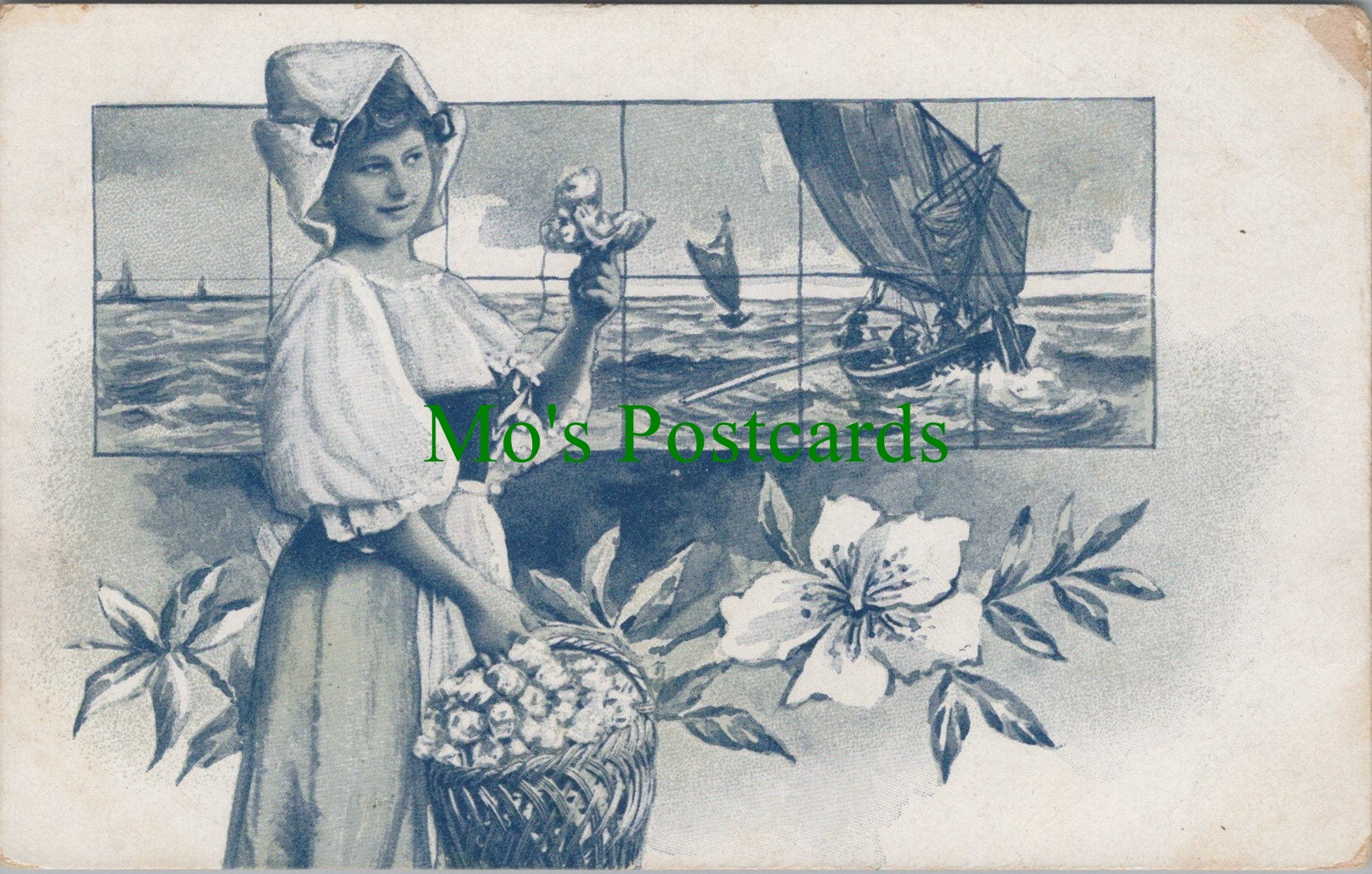 Mo's Ref:  Art Postcard - Lady and a Sailing Boat Scene SW12718
