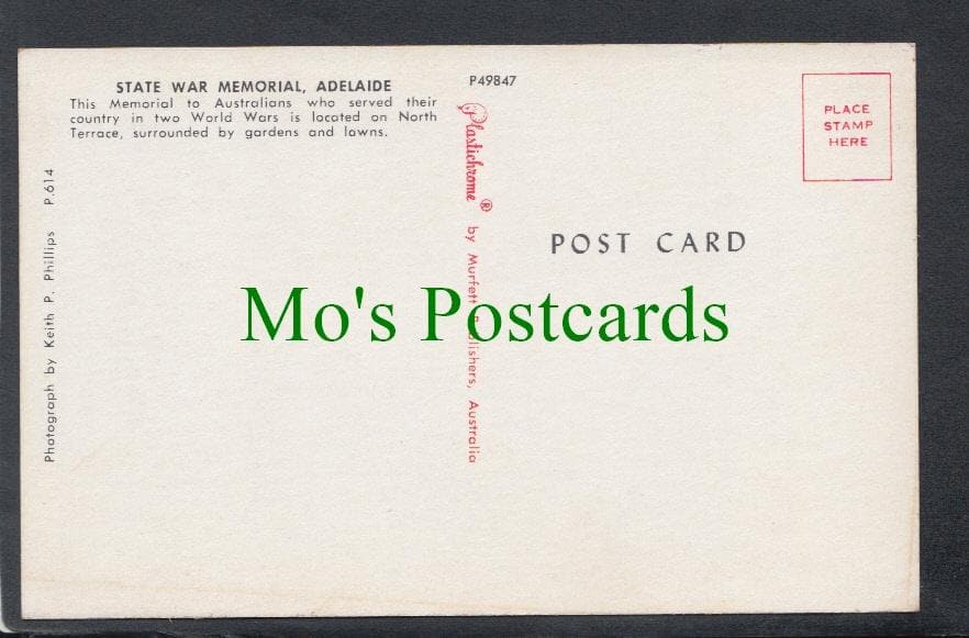 Mo's Postcards offers for sale a postcard showing the State War Memorial, Adelaide, Australia.