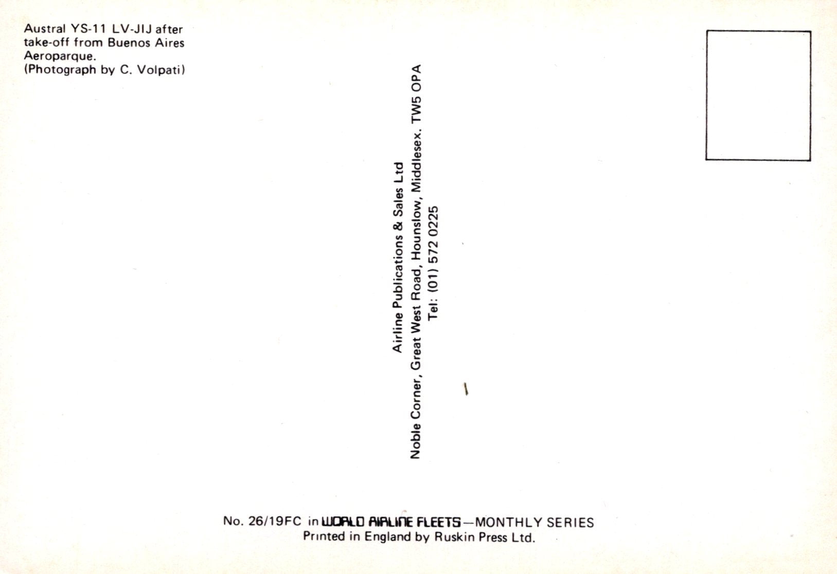 Aviation Postcard - Austral YS-11 LV-JIJ Aeroplane SW20309
