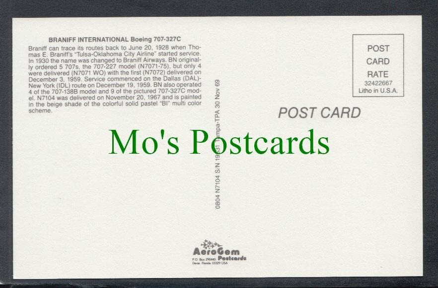 Mo's Postcards offers for sale an Aviation Postcard - Braniff International Boeing Aeroplane.