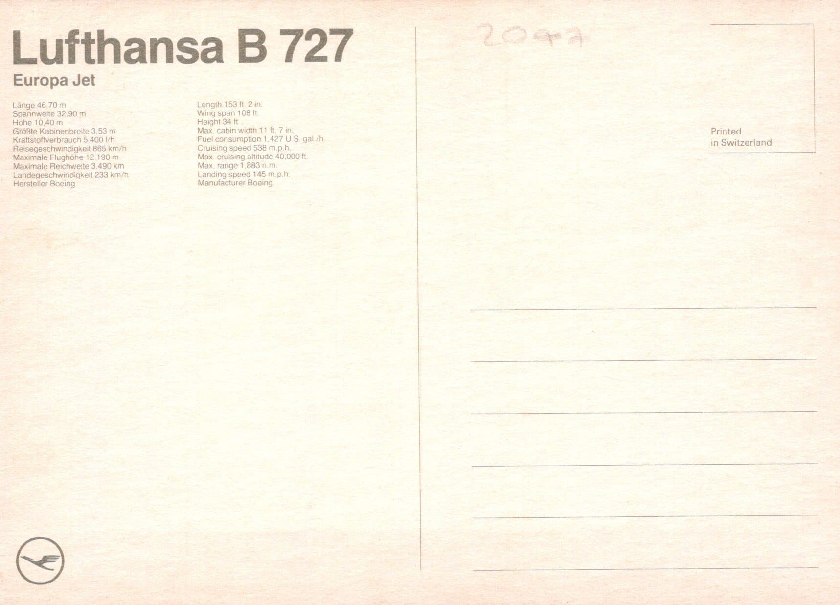 Aviation Postcard - Lufthansa B727 Europa Jet SW2509