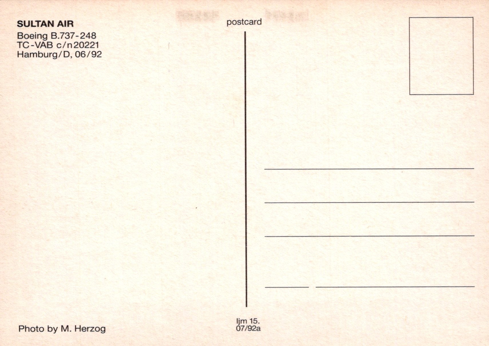 Back of a postcard from Sultan Air with airplane details and a photo credit.