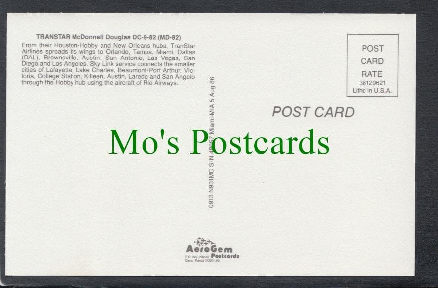 Mo's Postcards offers for sale an Aviation Postcard - Transtar McDonnell Douglas Aeroplane. DC-9-82