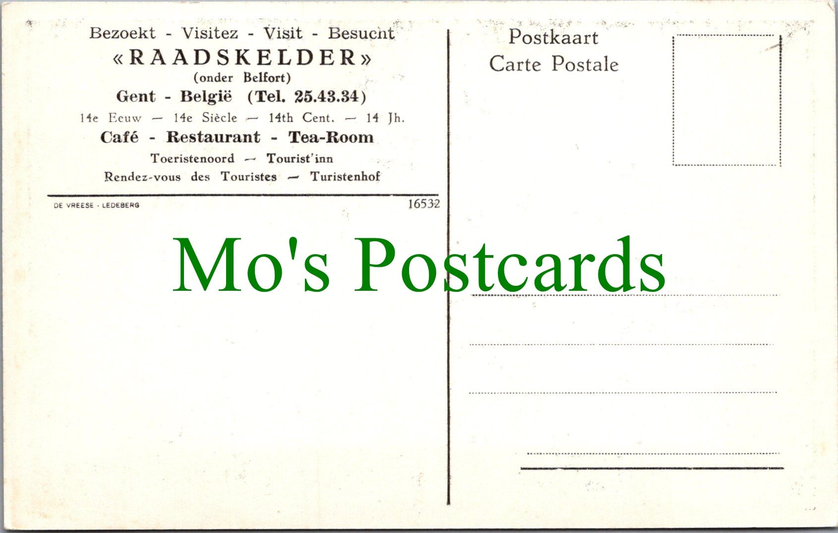 This is a postcard of the Cafe, Restaurant, Raadskelder, Gent, Belgium