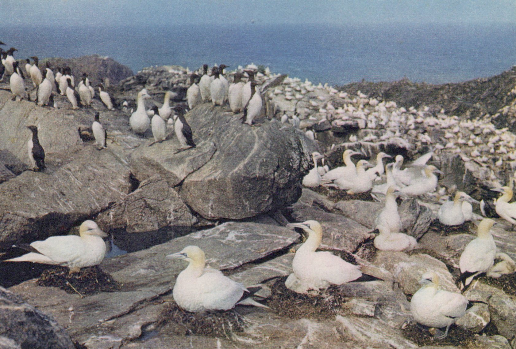 Seabirds, including gannets and puffins, on rocky cliffs with ocean in the background