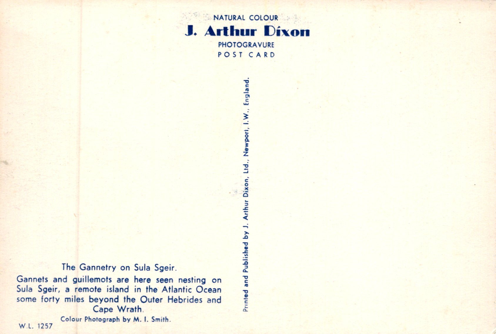 Back of a postcard with text about Gannets on Sula Sgeir, featuring J. Arthur Dixon's branding.