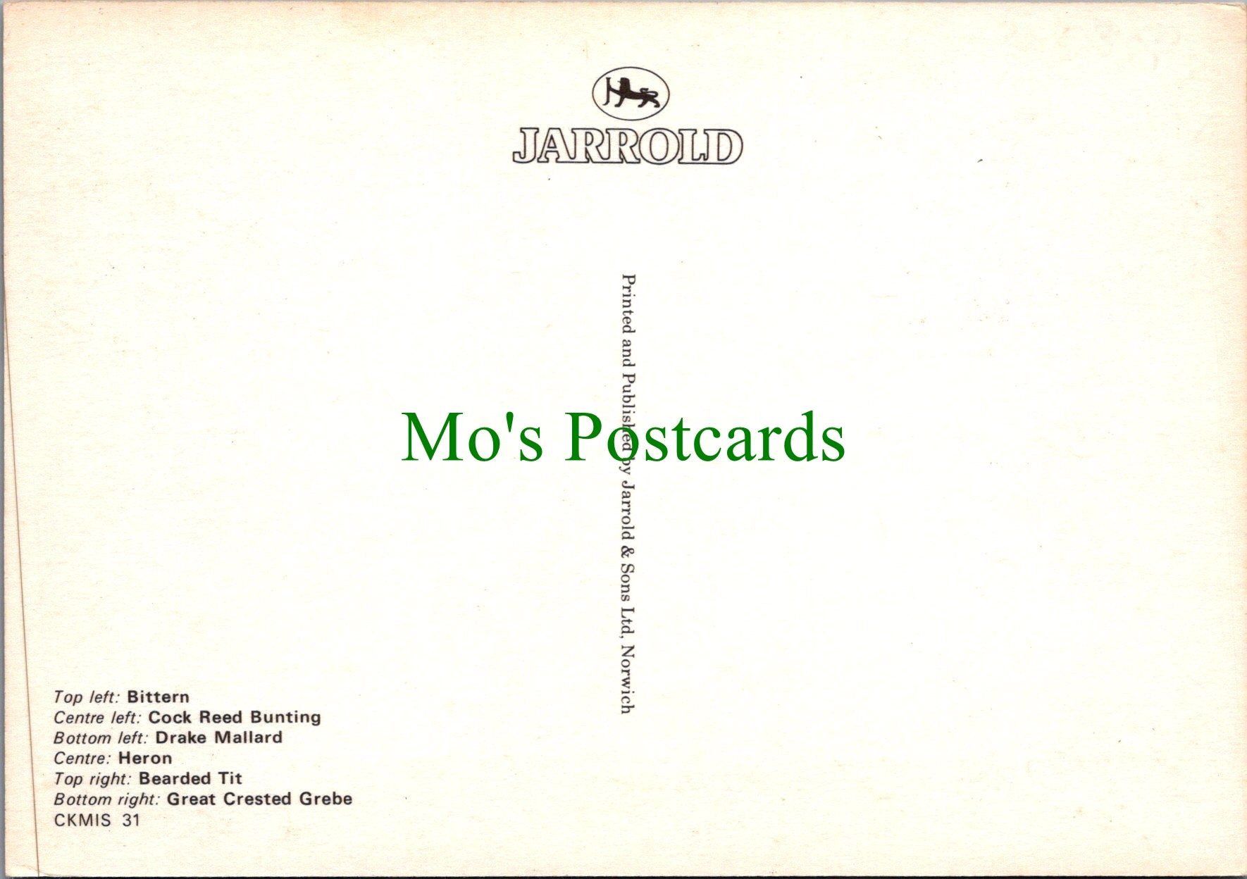 This is a postcard of Broadland Birds, Heron, Bittern, Drake Mallard, Cock Reed Bunting, Bearded Tit and Great Crested Grebe