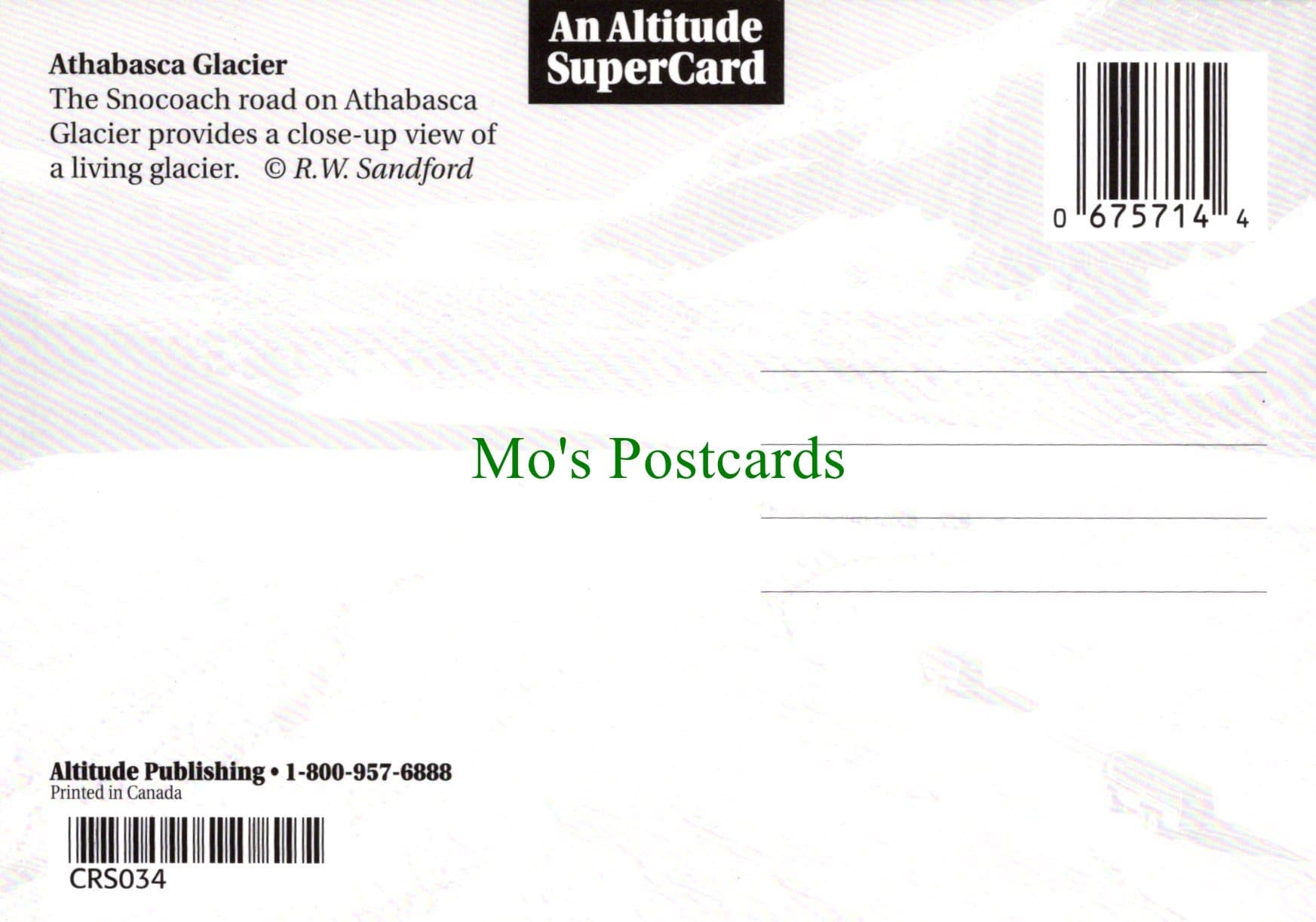 Mo's Postcards offers for sale a postcard showing Athabasca Glacier, The Canadian Rockies