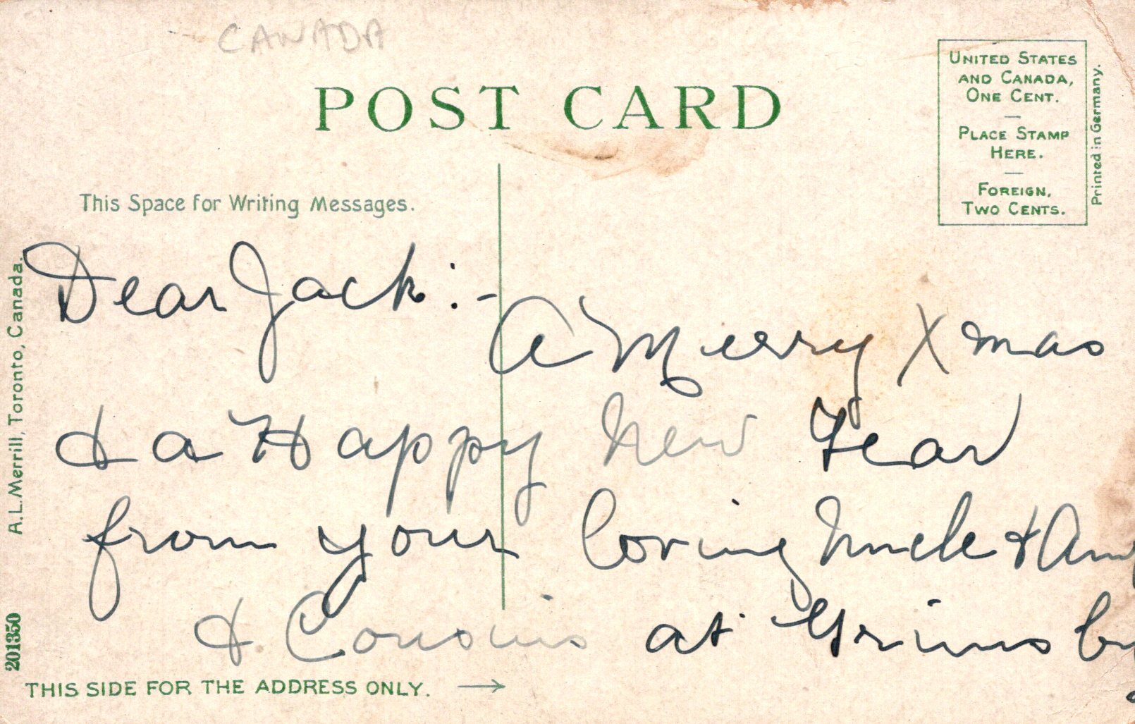 Postcard defect(s): Creasing to the right hand corners