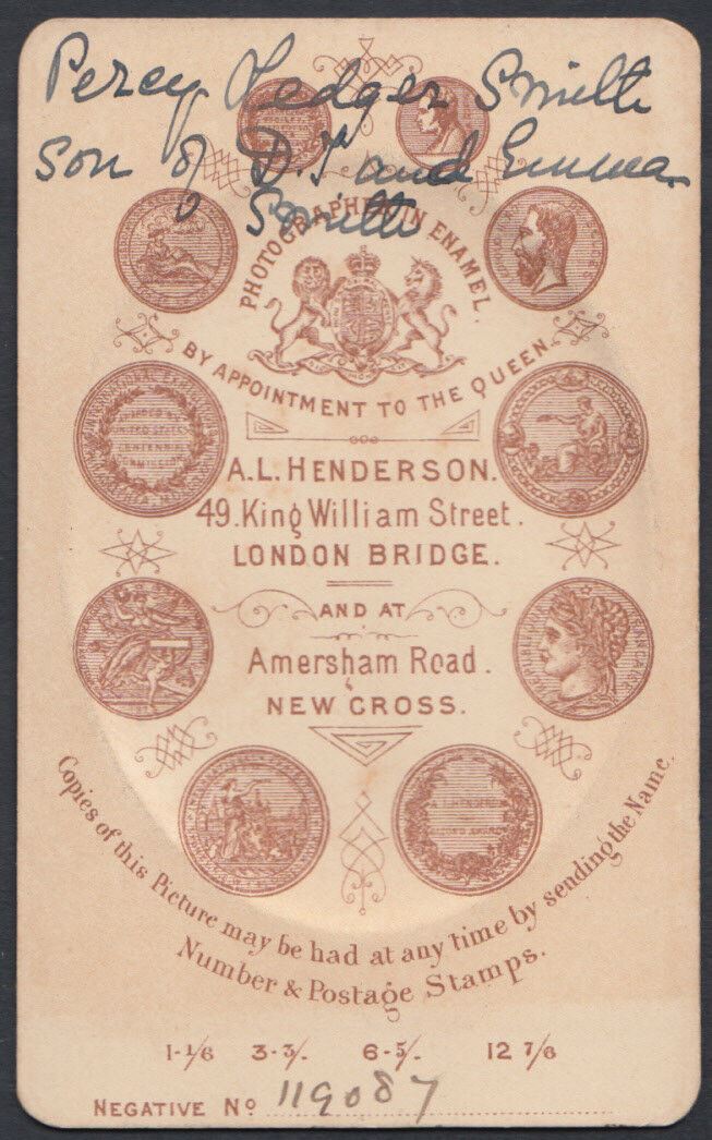 Carte De Visite Description: CDV (Carte De Visite) - Percy Ledger Smith, Son of D. ?. Smith & Emma Smith - A.L.Henderson, London