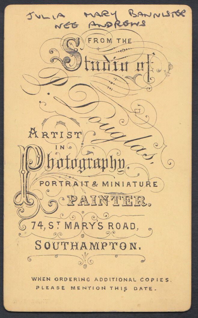 Carte De Visite Description: CDV (Carte De Visite) - Southampton Lady, Julia Mary Bannister Nee Andrews - P.Douglas, 74 St Mary's Road, Southampton