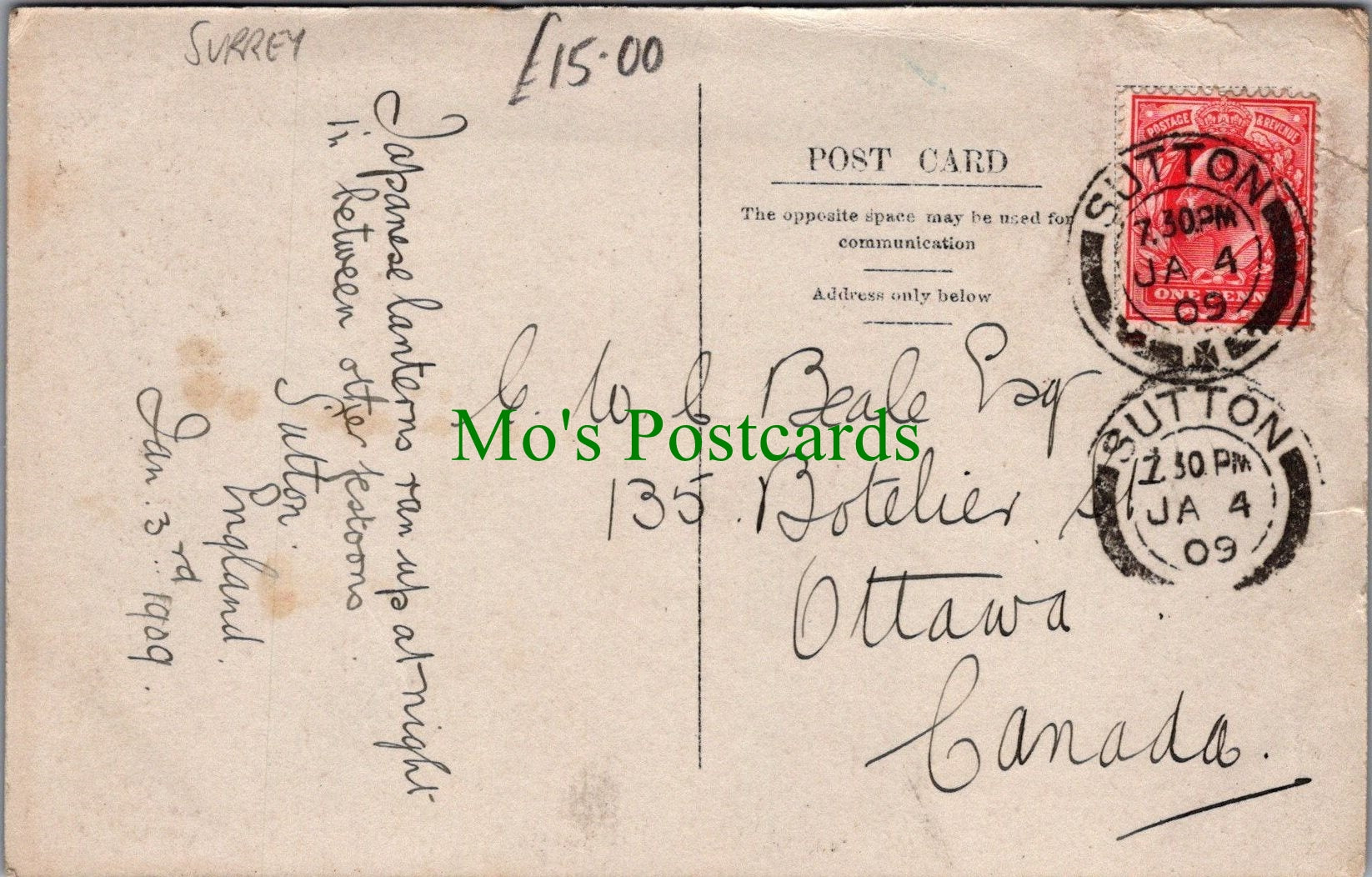 Xmas Show Week, High Street, Sutton, Surrey. This is a fantastic standard sized postcard which would be a great addition to your postcard collection.  From the S & W series. Posted in 1909.