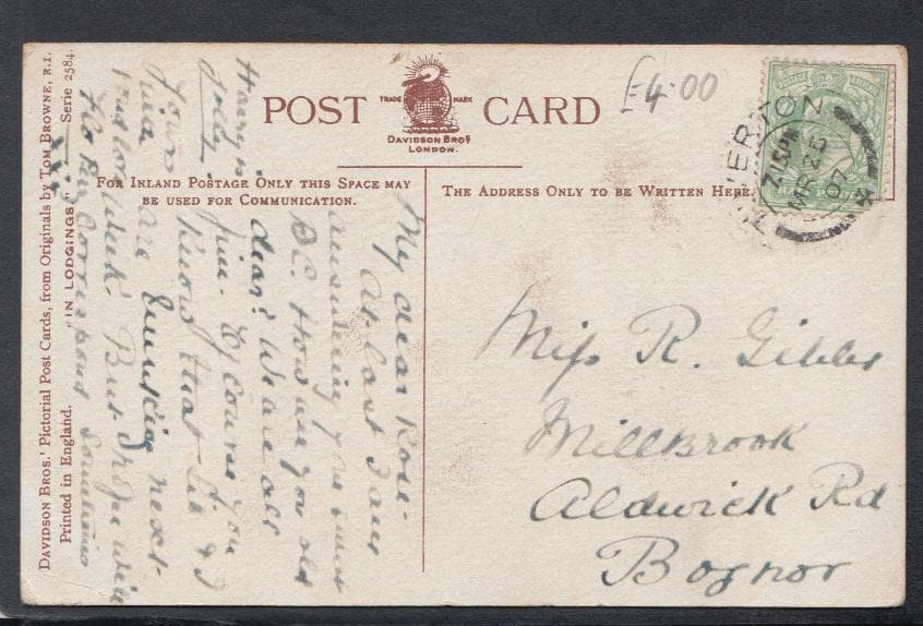 Comic Postcard - Piano / Music / Landlady / Lodger / "In Lodgings" - Artist Tom Browne, 1907 - Mo’s Postcards