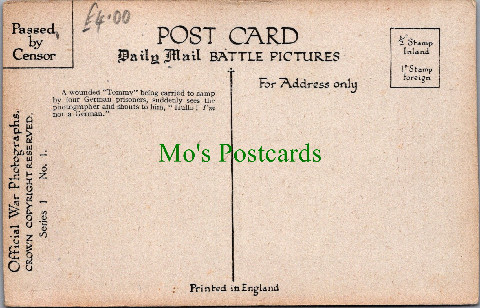 Military Postcard - Wounded Tommy To The Photographer: "I'm Not a German!". This is a fantastic standard sized postcard which would be a great addition to your postcard collection. From The Daily Mail battle picture series.