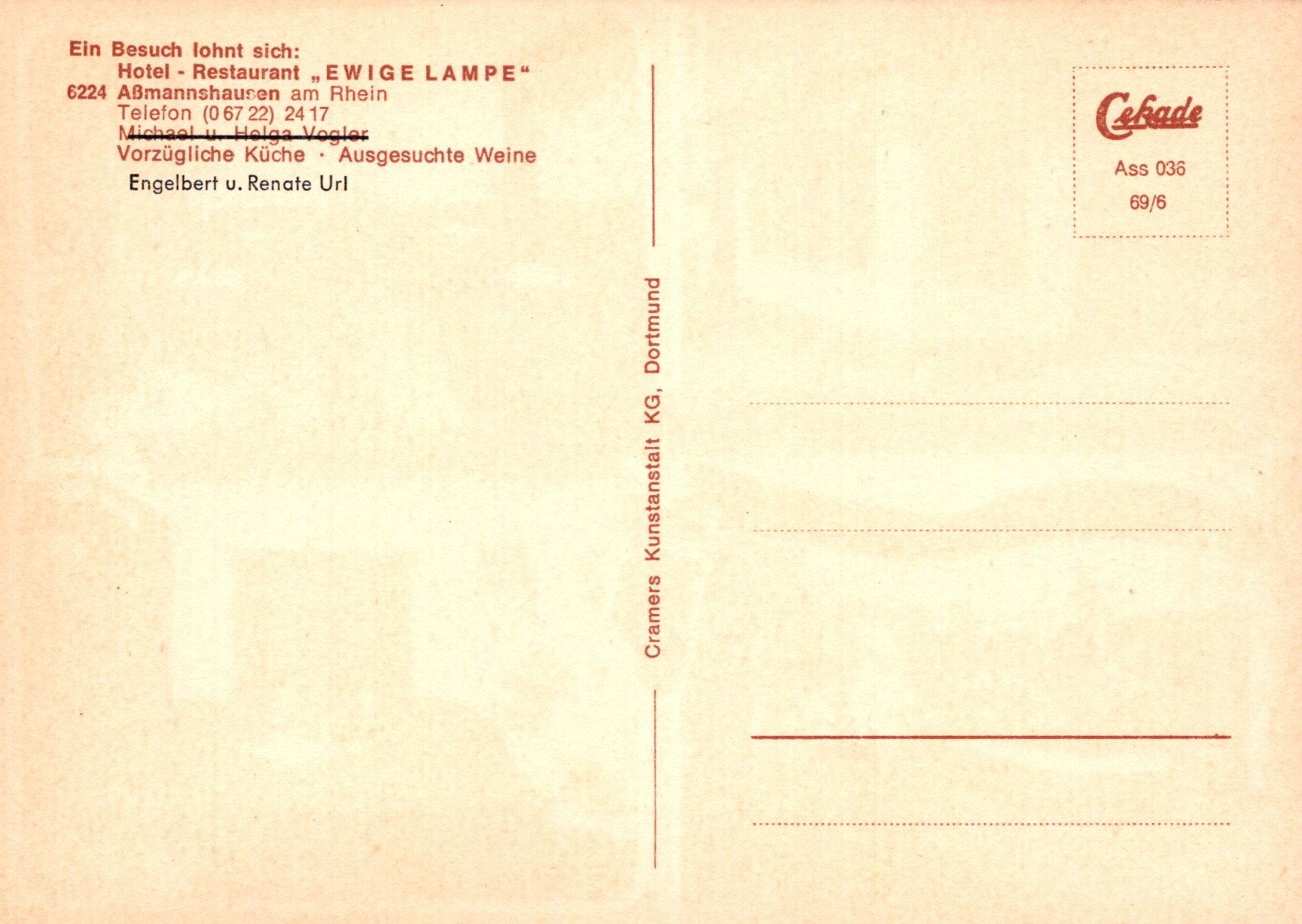 This is a Germany Postcard - Hotel Restaurant Ewige Lampe, Assmannshausen Am Rhein SW19991