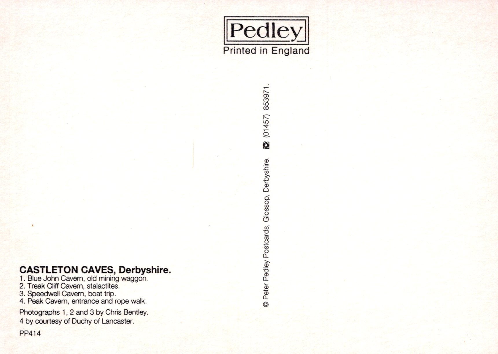 Back cover of a book or magazine with 'Pedley' branding and text about Castleton Caves, Derbyshire.