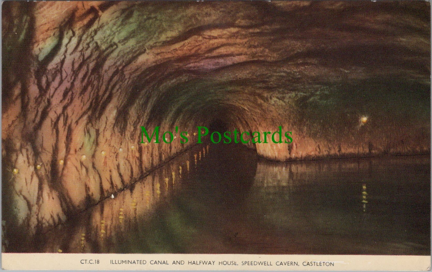 Mo's Postcards offers for sale postcard showing Speedwell Cavern, Castleton, Derbyshire. Illuminated Canal and Halfway House.