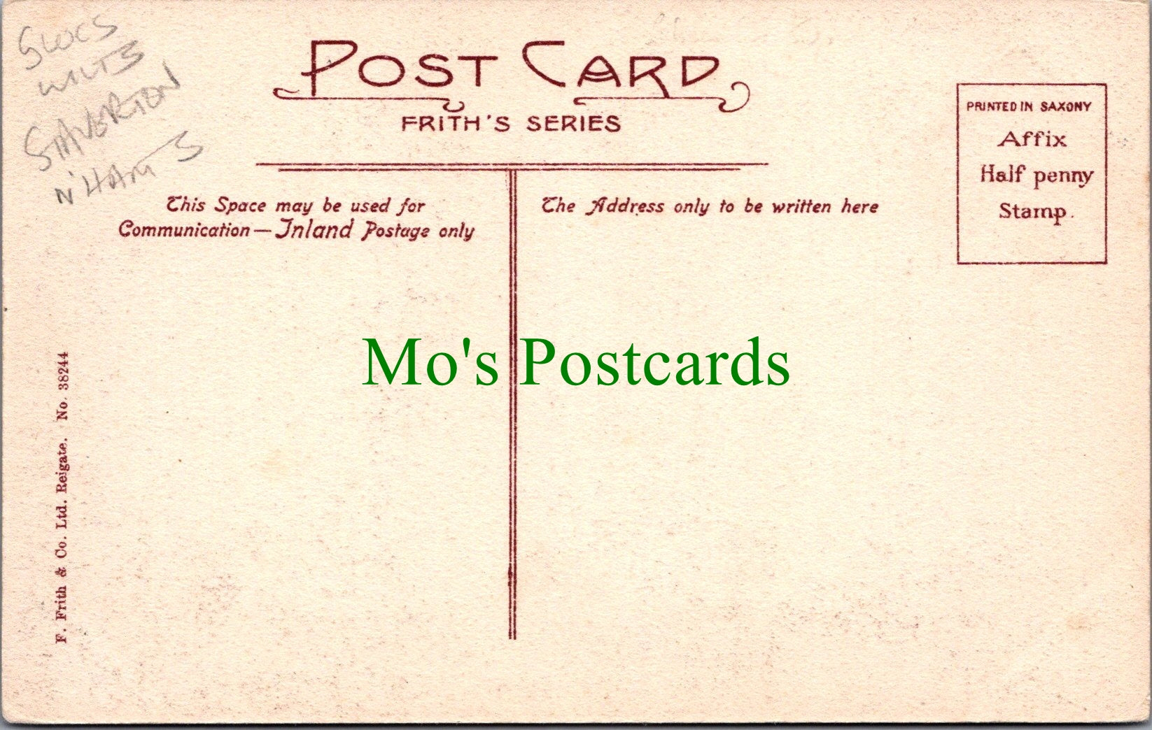 All of our postcards are posted to you inside a plastic sleeve and a board backed envelope which will be marked 'Please do not bend'. The 'Mo's Postcards' watermark does not appear on the actual postcard'.