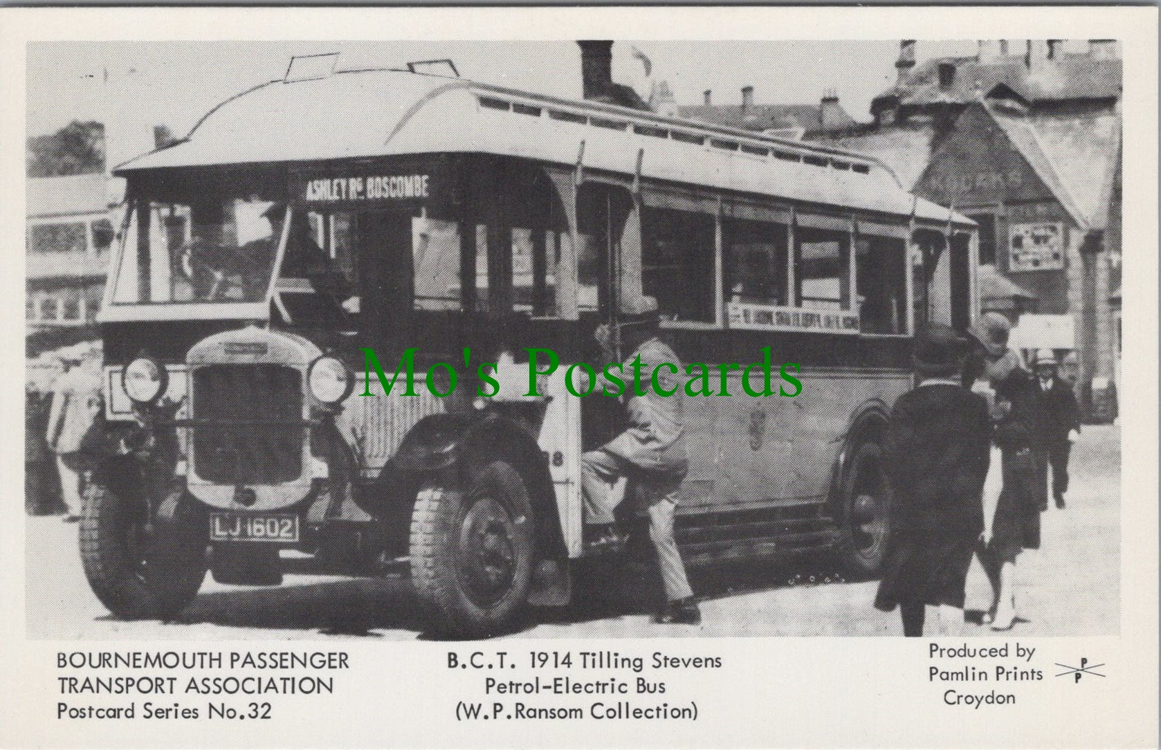 This is a Dorset Postcard - Bournemouth Passenger Transport Association. B.C.T.1914 Tilling Stevens Petrol-Electric Bus SW13444