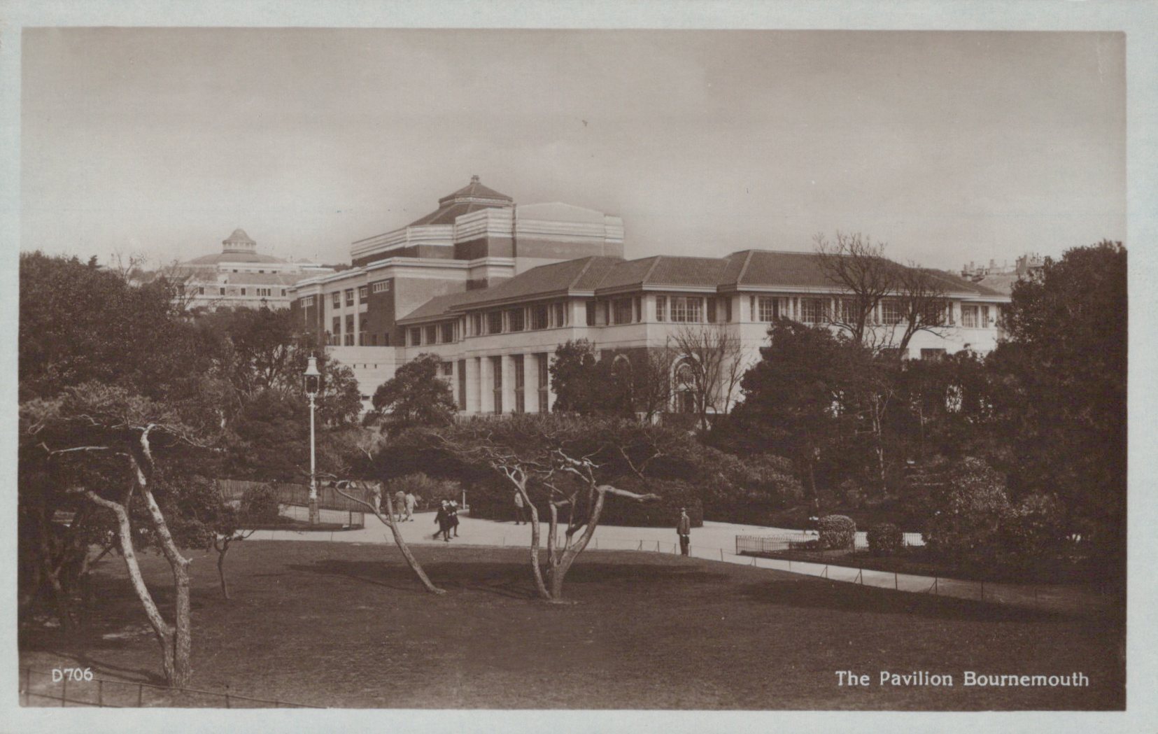 Vintage black and white photograph of a large building with 'The Pavilion Bournemouth' text.