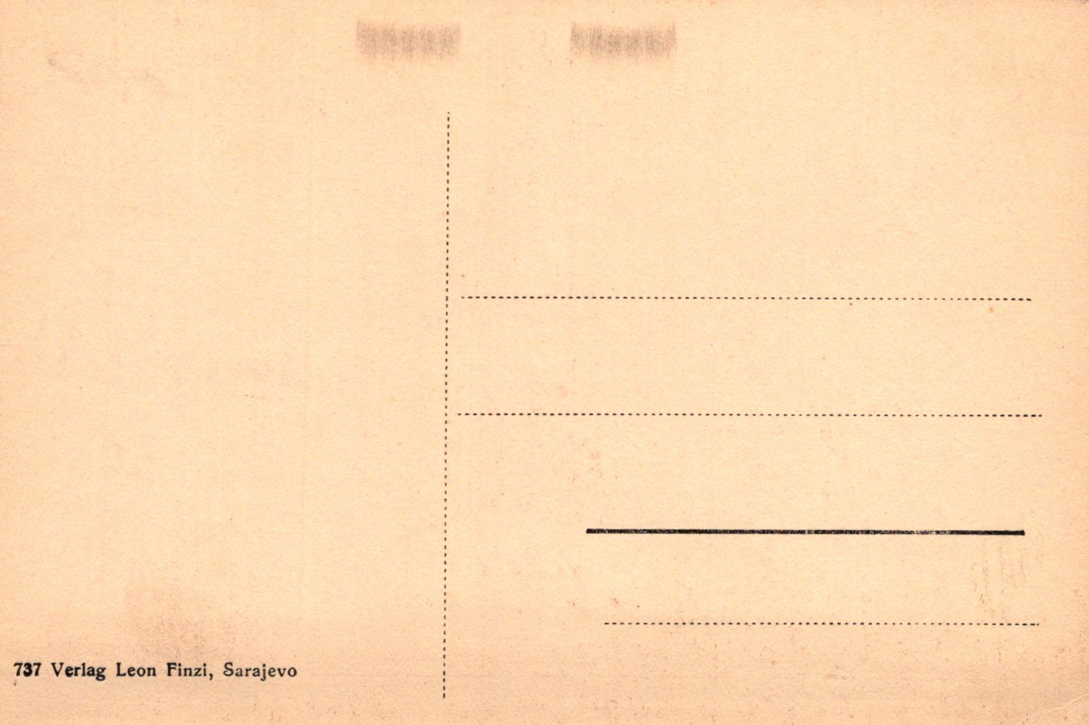 • Load image into Gallery viewer, Beige postcard with text and lines for writing, featuring 'Verlag Leon Finzi, Sarajevo' at the bottom.