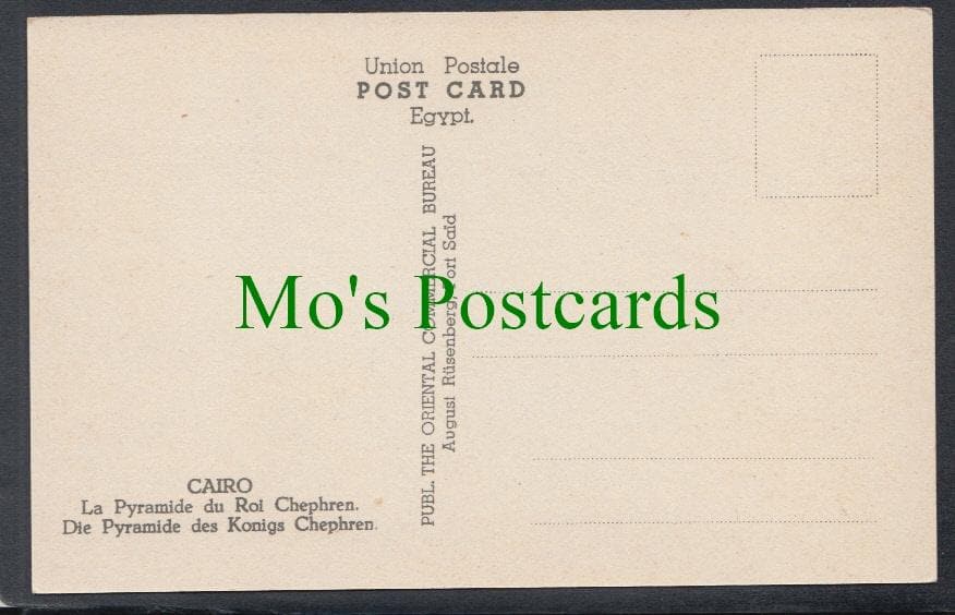 Mo's Postcards offers for sale a postcard showing The Pyramid Tomb of King Chephren, Cairo, Egypt.