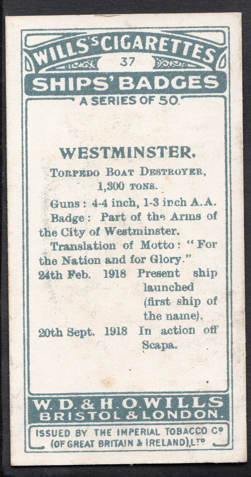 Mo's Ref: Wills Cigarette Card - Ships Badges Card No 37 - Westminster