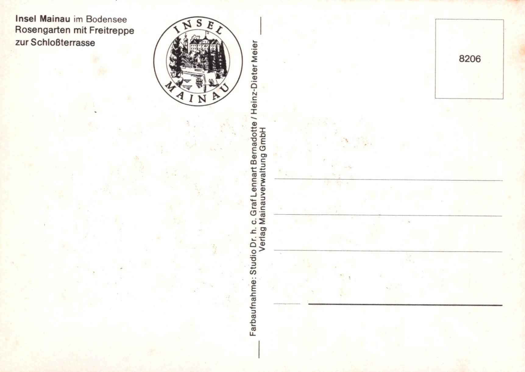 • Load image into Gallery viewer, Vintage postcard with 'Insel Mainau' logo and text on a white background
