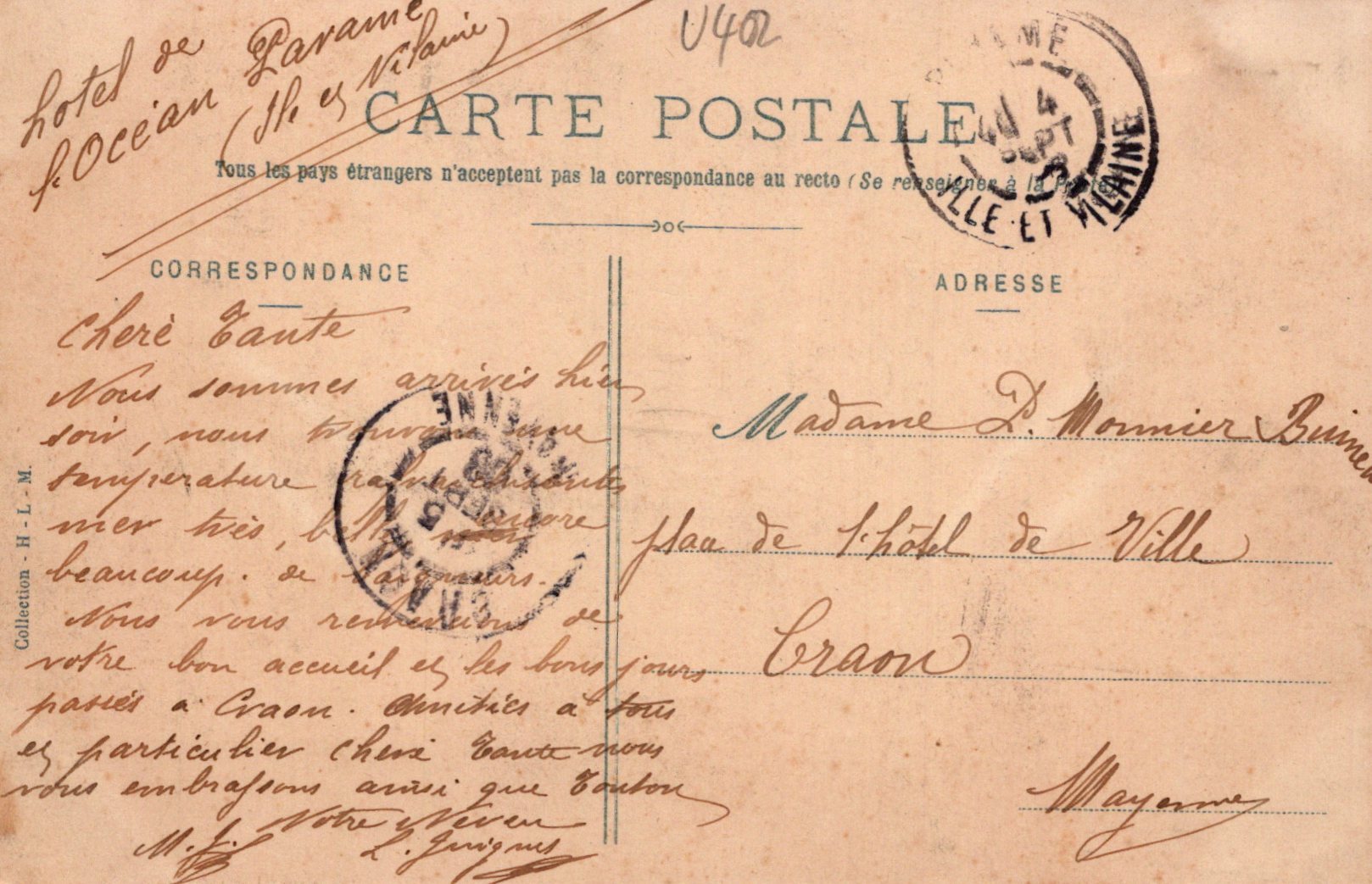 • Load image into Gallery viewer, Vintage French postcard with stamps and handwritten text