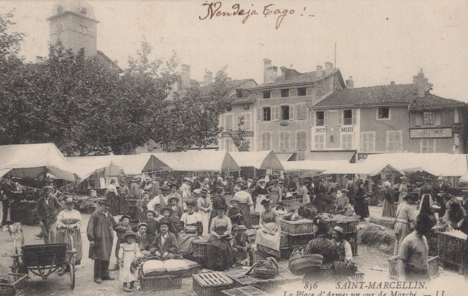 Vintage postcard of a market scene in Saint-Marcellin with people and tents.