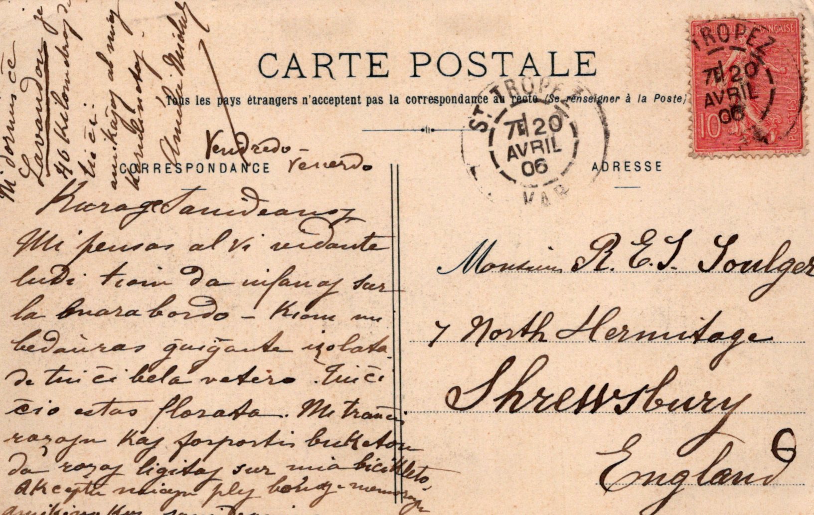 Vintage postcard with text and postage stamp, addressed to Shrewsbury, England