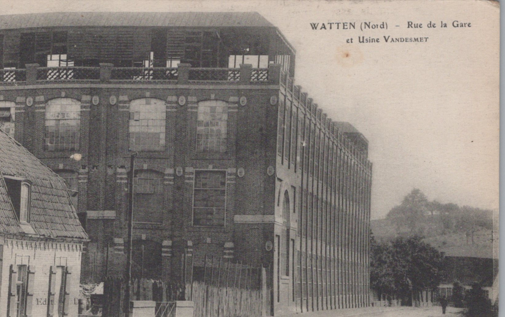 Vintage black and white photo of a building with 'Watten (Nord) - Rue de la Gare et Usine Vandemet' text.