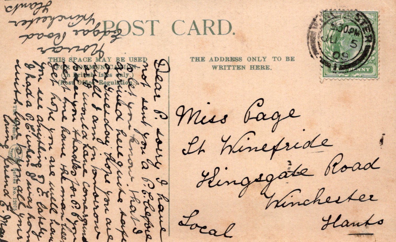 Postcard size: Standard. Posted in 1909