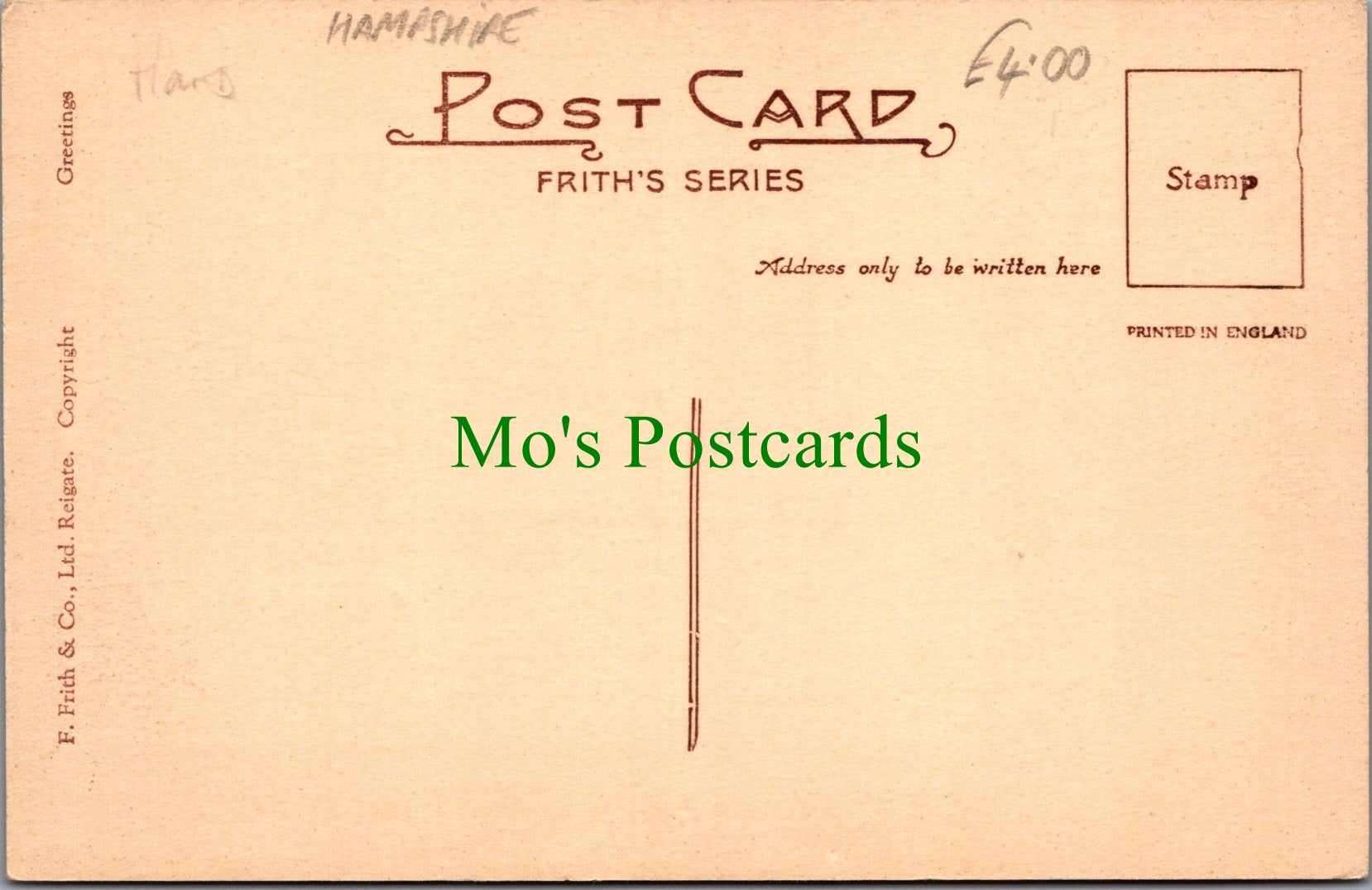 All of our postcards are posted to you inside a plastic sleeve and a board backed envelope which will be marked 'Please do not bend'. The 'Mo's Postcards' watermark does not appear on the actual postcard'.