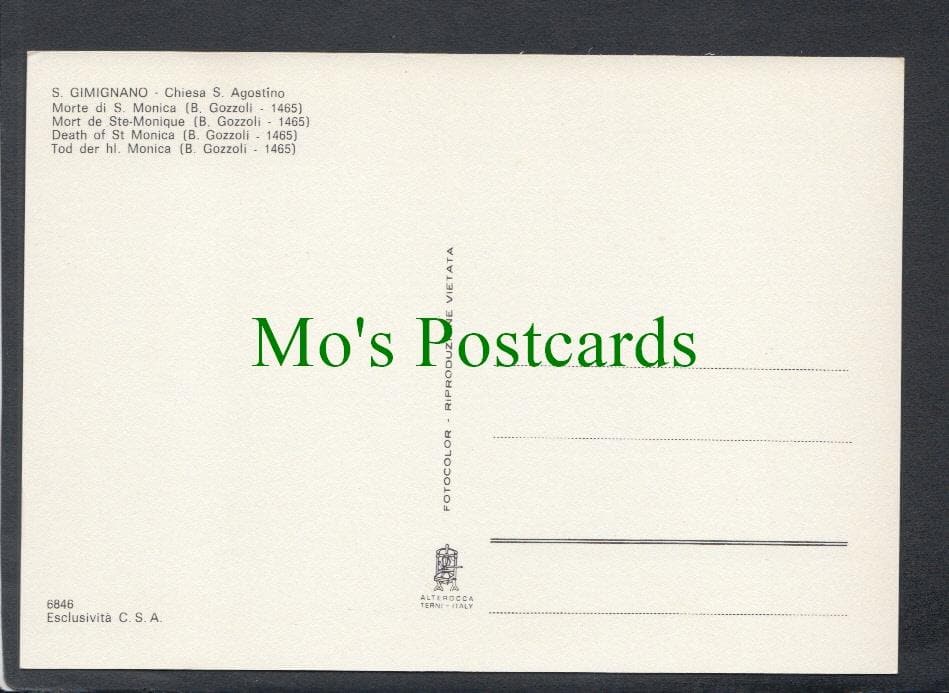 Mo's Postcards offers for sale a postcard of the Death of St Monica, S.Gimignano, Italy.