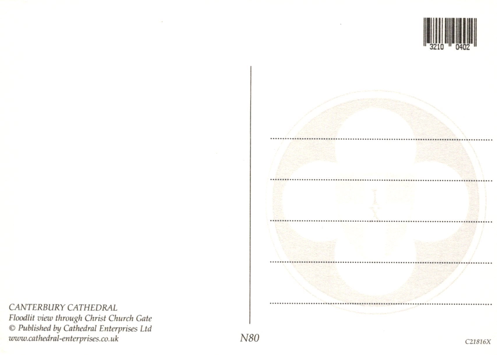 Back of a postcard with a floodlit view of Canterbury Cathedral, featuring text and a barcode.