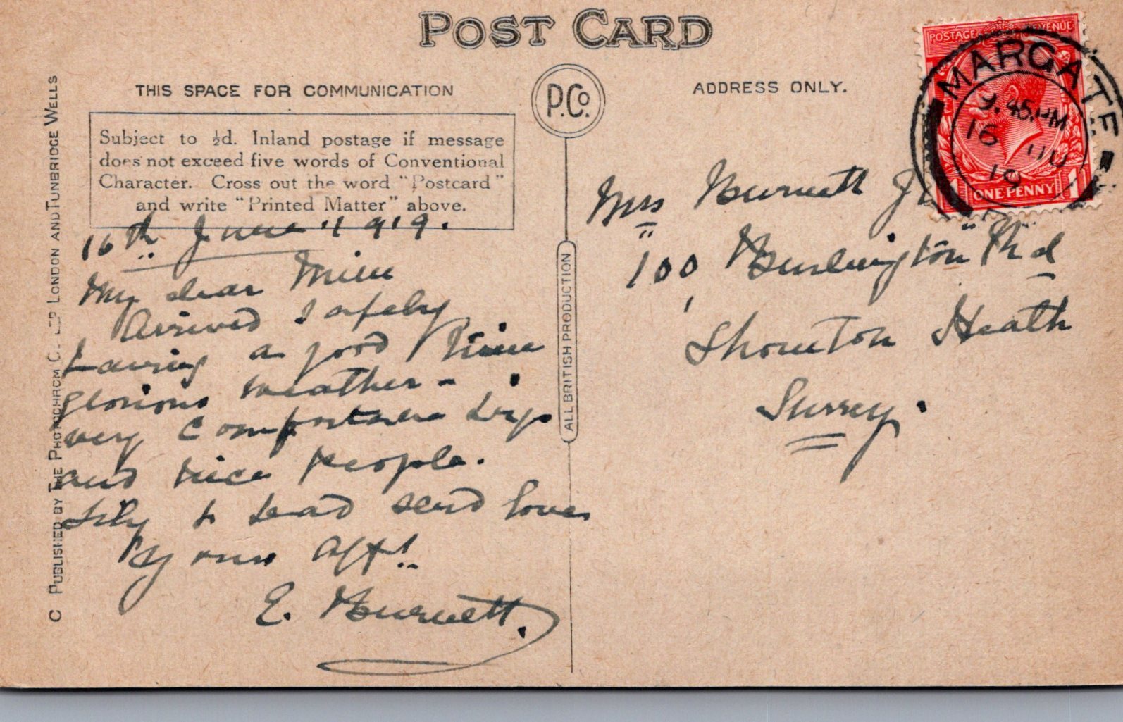 Postcard size: Standard. Posted in 1919