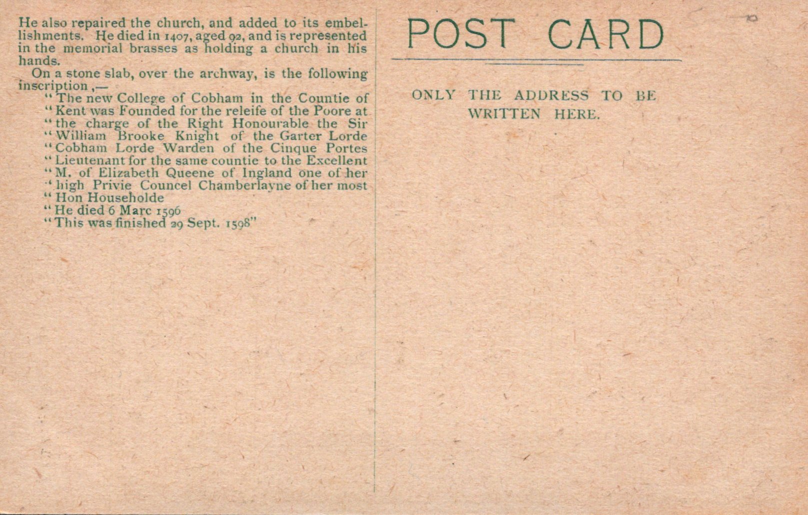 This is a Kent Postcard - Part of The Ancient Priory, Cobham College VT59