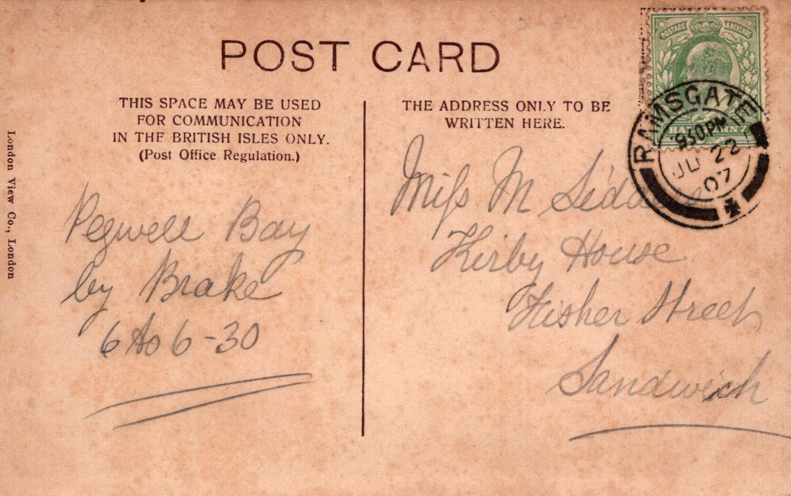 Postcard size:  Standard. Posted in 1907