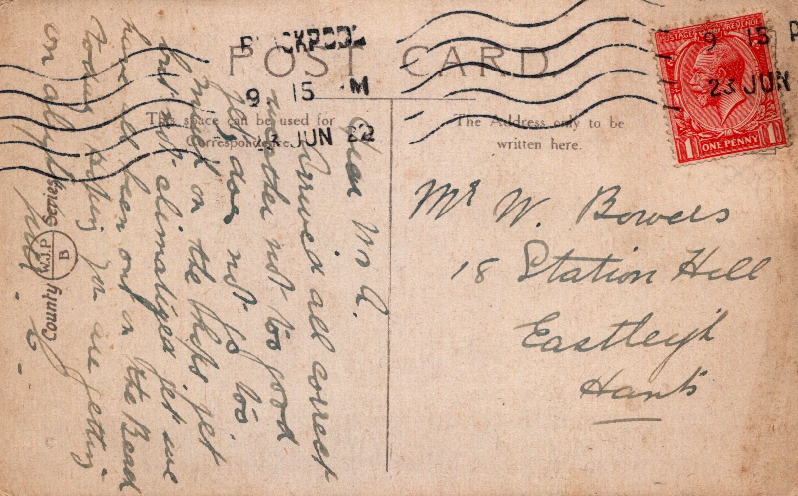 Postcard size: Standard. Posted in 1922